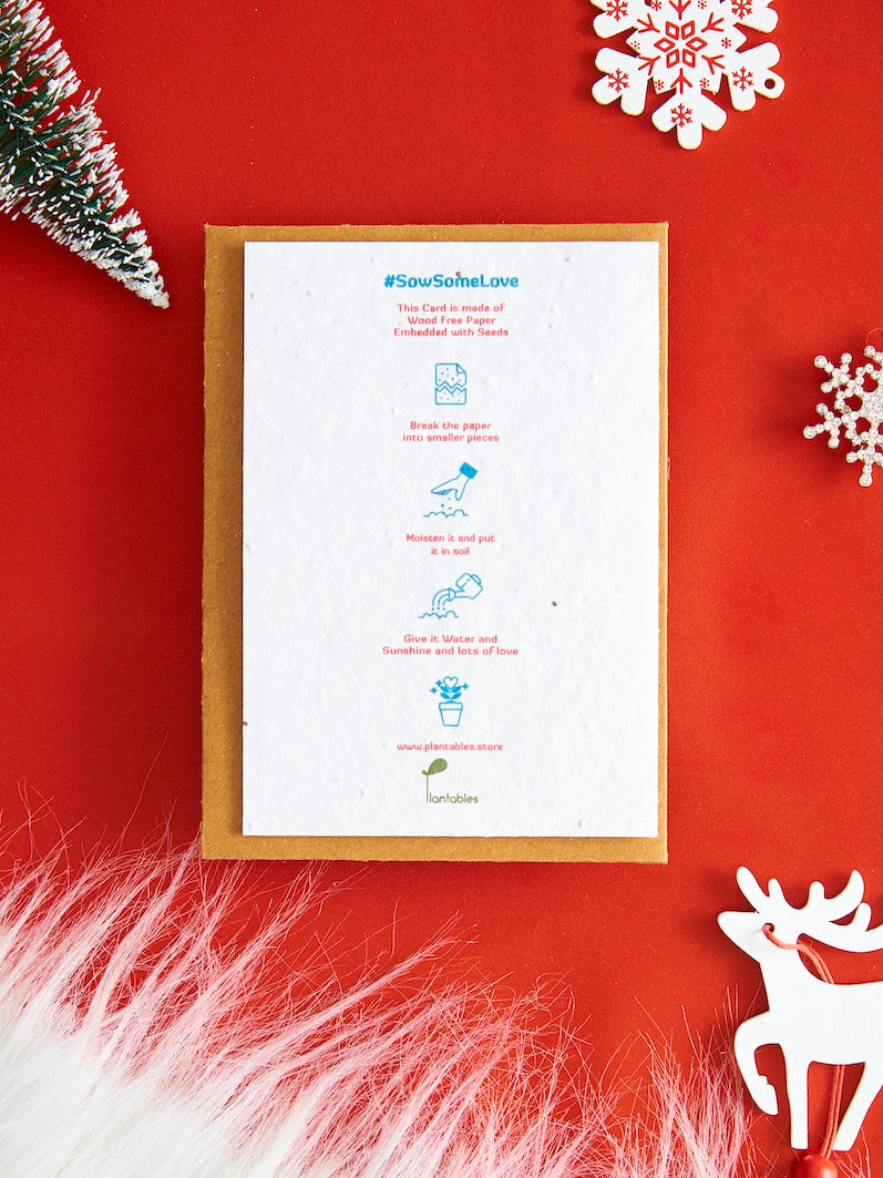 Bright red poinsettias and mistletoes bring out the holiday cheer in full gusto. A heartfelt season’s greeting card for your loved ones cuz ‘tis the season to #SowSomeLove! Our Plantable greetings are made from 100% upcycled cotton scrap paper with seeds embedded in them.